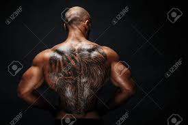 Homme Muscle Unrecognizable Avec Le Tatouage Sur Le Dos Contre De Fond Noir Isole Banque D Images Et Photos Libres De Droits Image 69586551